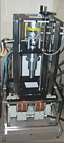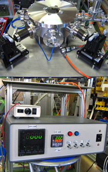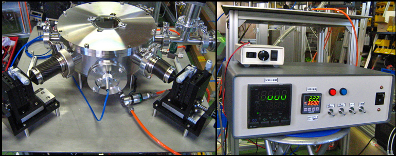 - 本装置は厚さ約20mmの超伝導ケーブル試料の断面を表裏からCCDカメラで拡大して撮影しながら、任意のケーブルの抵抗を測定するための装置です。