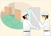 搬出、搬入経路に建物養生を設置します。輸送路とお客様通路を明確にして安全に配慮致します。